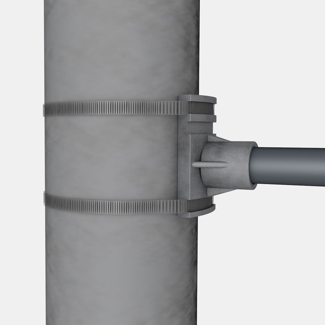 1 Set bestehend aus: 2 Stück Alugusshalterungen (B x H x T ca. 4 x 11 x 7 cm) mit ca. 3° Neigungswinkel, silberfarben, 2 Stück Auslegerarme aus Fiberglas (60 cm: Auslegerarmlänge ca. 68 cm; 90 cm: Auslegerarmlänge ca. 100 cm), ca. 20 mm Stangendurchmesser, 2 Stück Sicherungs-Ringösen zur Fixierung der Auslegerarme im Halter, 4 Stück Schlauchschellen mit Schneckengewinde aus rostfreiem Metall, ca. 90 cm lang, für Mastdurchmesser ca. 60 bis 250 mm