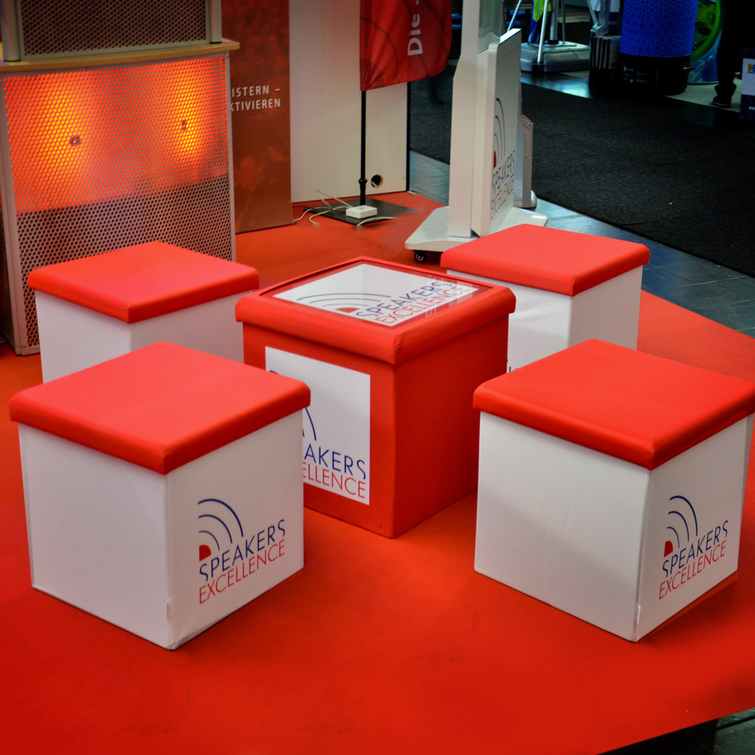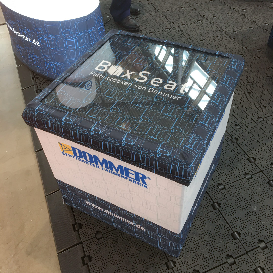 Unsere faltbaren Sitzhocker "BoxSeat®" ersetzen zunehmend die bei Messen und Events als Sitzmöglichkeiten beliebten Schaumstoff Sitzwürfel, da die faltbaren Sitzhocker deutlich einfacher zu transportieren sind und durch den zusätzlichen Stauraum bei Messen und Events auch noch als Aufbewahrungsboxen genutzt werden können. Die Drucke werden über Klettband fest mit dem Falttisch verbunden und ermöglichen so zusätzlich einen problemlosen Austausch.