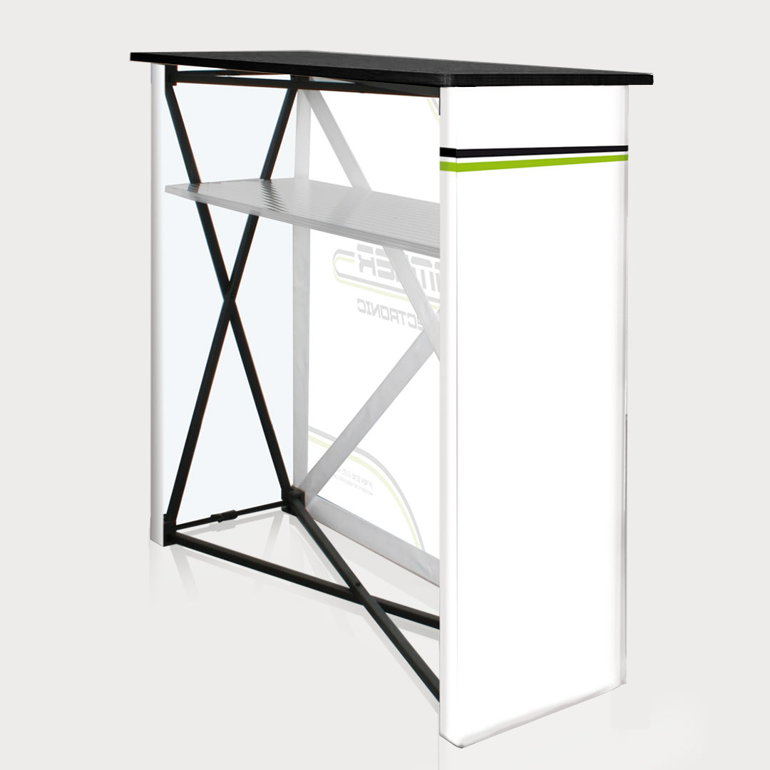 Die PopUp Theke besteht aus einem Scherengittersystem, das im Handumdrehen aufgebaut werden kann. Durch die ebenfalls individuell bedruckte Bespannung fügt sie sich in Ihren Promostand ein.
